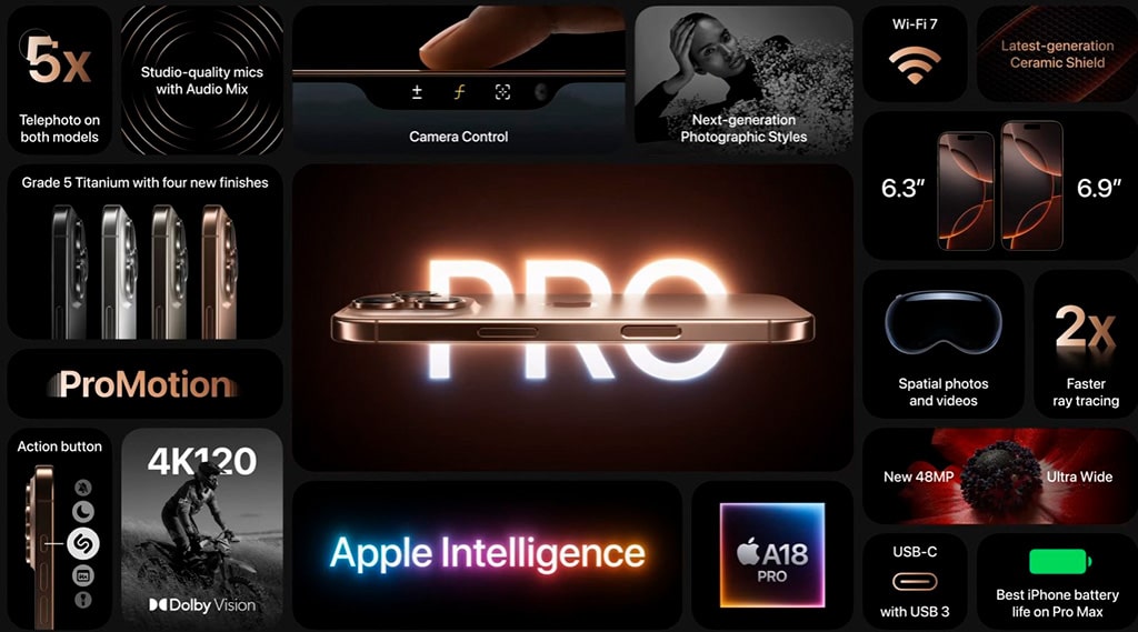 Extras: Cuerpo de titanio, IP68, Action Button, Camera Control, Face ID, diseño térmico optimizado.
